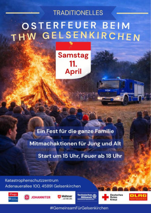 Am Samstag, 11. April 2026, laden die Gelsenkirchener Hilfsorganisationen herzlich zum traditionellen Osterfeuer am Katastrophenschutzzentrum Gelsenkirchen ein.
